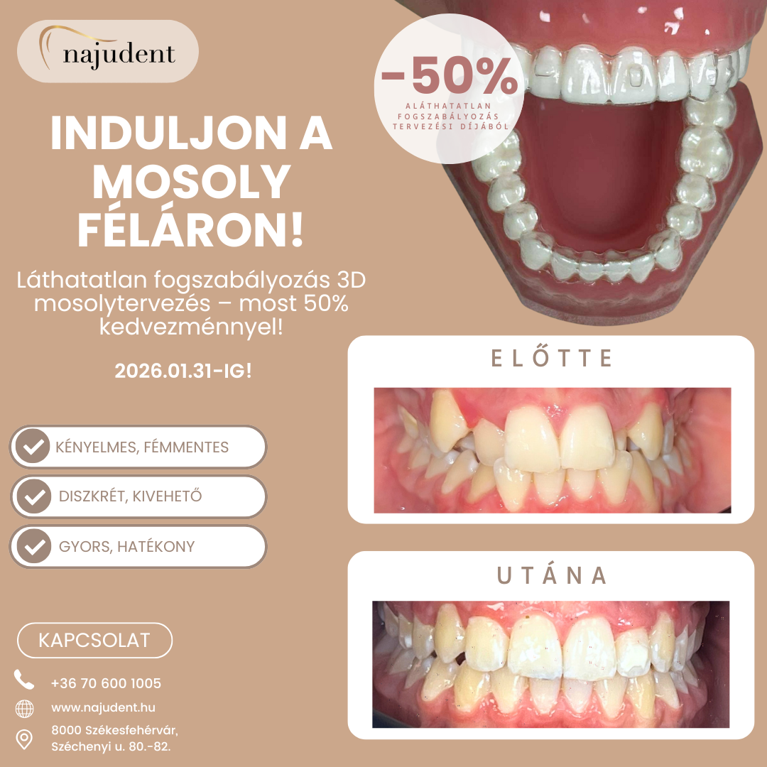 Ha te is kipróbálnád a láthatatlan fogszabályozást, a tervezési díj most 50% kedvezménnyel érhető el, így féláron teheted meg az első lépést a magabiztos, harmonikus mosoly felé!